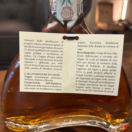 - **Descrizione:** La grappa riserva è invecchiata per un periodo più lungo, spesso oltre i cinque anni, per ottenere un prodotto ancora più raffinato e complesso. Ha un colore dorato e offre una gamma di sapori più intensi e avvolgenti.